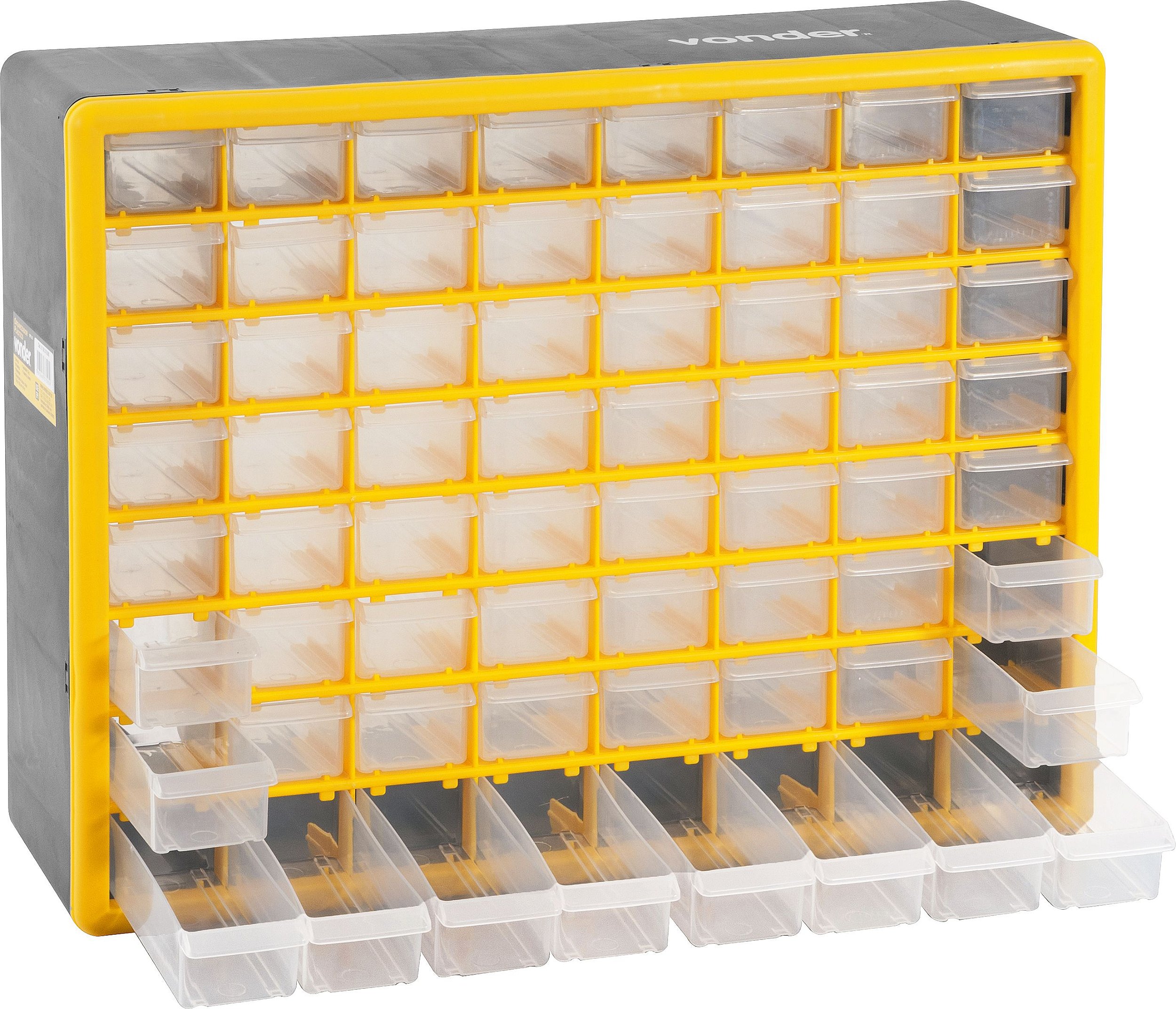 Possui 64 gavetas proporcionando a armazenagem de grande variedade de itens.